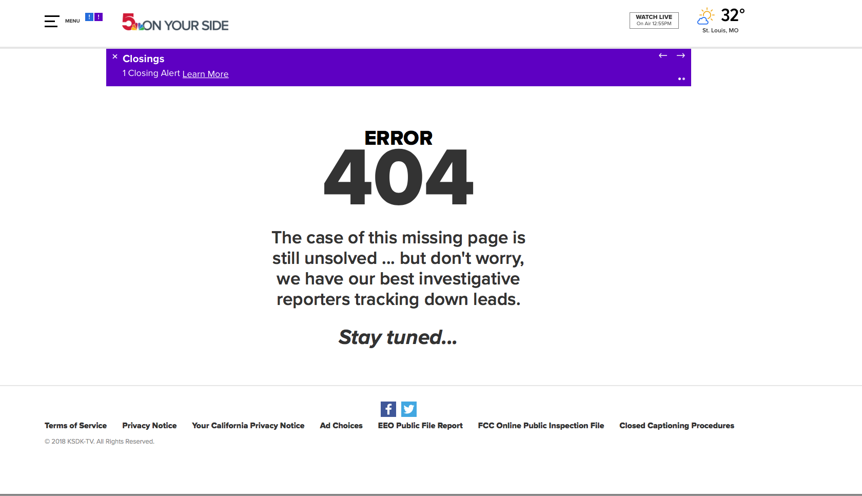 KSDK says that the missing page is easily explained:  “A few years ago, we updated our publishing system, which in turn invalidated the links to articles published prior to that date. We are also unable to access these stories.”