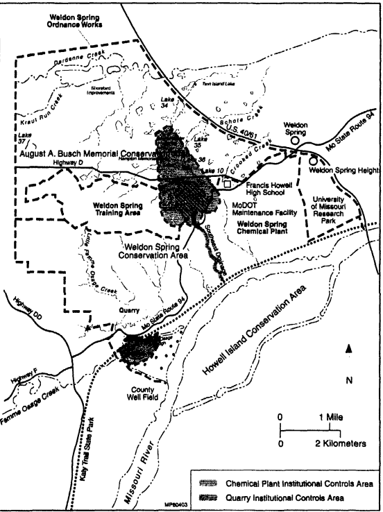 In 2005, the DOE published its land use restrictions for the Southeast Drainage area — a  200-foot-wide, 37-acre tract that traverses the land between the proposed residential development and the abandoned Hamburg Quarry. At that time, DOE ruled that long-term institutional controls be imposed due to unsafe levels of radiation that still persist even after the completion of the clean up of that area. The affected tract is now owned by the Missouri Conservation Commission.